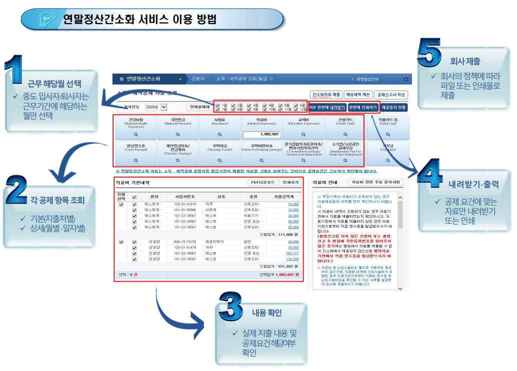 국세청 홈택스 연말정산 간소화 서비스에서 소득공제. 세액공제 증명서를 다운로드하거나 출력할 수 있습니다. 국세청의 "연말정산 간소화 서비스"는 대부분의 데이터를 시스템에 자동으로 반영합니다. 보통 90% 정도는 국세청 홈텍스에서 내려받을 수 있습니다. 빠진 항목에 대해서는 본인이 추가로 증빙서류나 영수증을 준비하면 됩니다.