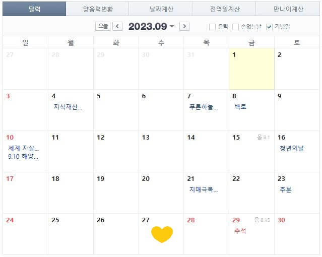9월 28일(목)부터 30일(토)까지 추석 연휴입니다. 10월 2일(월)에 연차를 사용하게 되면 10월 3일 개천절을 포함하여 총 6일간의 휴가를 보내실 수 있습니다. 여기에 추가 연차 사용이 가능하다면 9월 27일에도 사용하기 좋아 보입니다. 또 한글날이 9일 월요일이어서 3일간 쉴 수 있습니다.